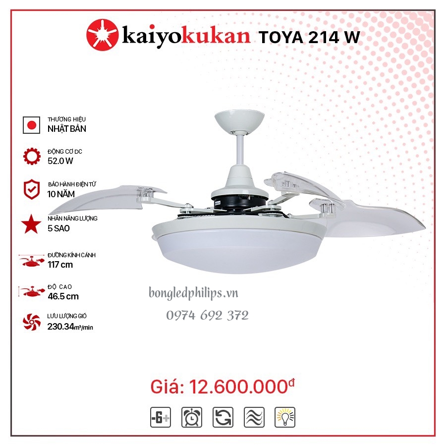 Quạt trần TOYA 214 với thiết kế đơn giản, mang phong cánh hiện đại, kết hợp giữa đèn chiếu sáng và quạt trần.